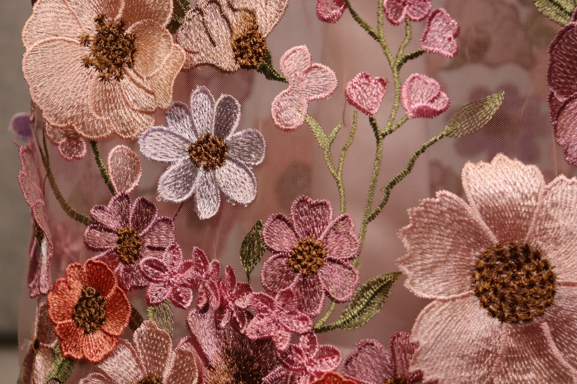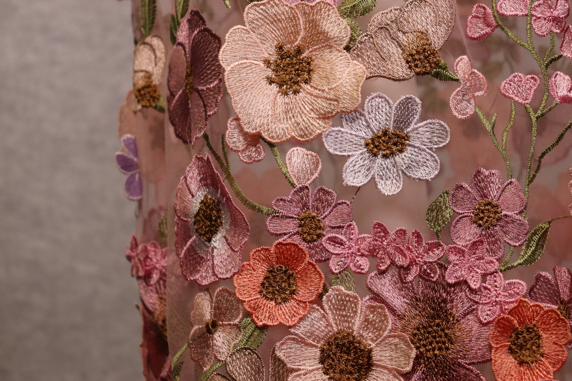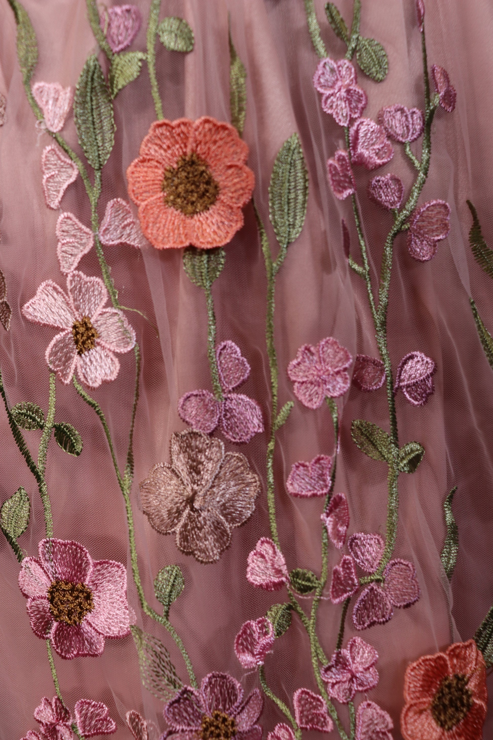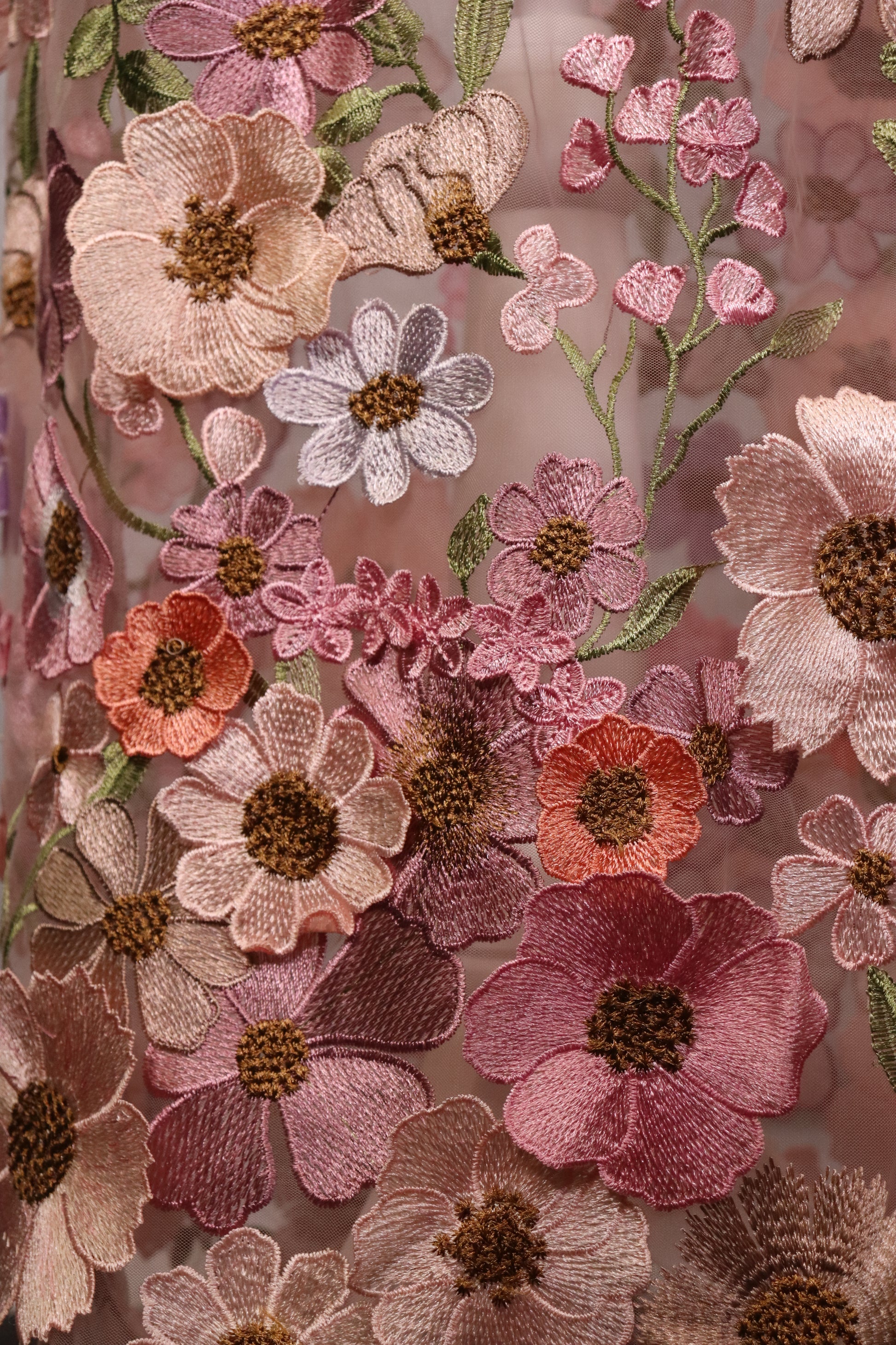 She’s not just a skirt — she’s an eye-catching, one-of-a-kind piece made from elegant pink tulle lace fabric with colorful 3D floral embroidery that brings life and movement with every step.